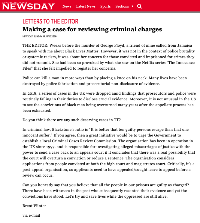 A Trinidad attorney raised alarms after a simple conversation sparked a national question: what if innocent people are behind bars? Brent Winter began his career as a prison officer, spent a decade prosecuting cases, and now defends the accused. In 2020, after a friend in Jamaica asked him about Netflix’s The Innocence Files, he wrote to the Trinidad and Tobago Newsday warning that “police can kill a man in more ways than by placing a knee on his neck.”
